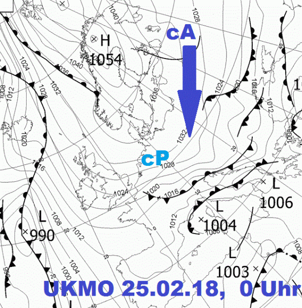Abbildung 8: Bodenwetterkarte vom 25.02.2018, 0 Uhr. Am Rande eines extrem kräftigen Hochdruckgebietes über Skandinavien strömte extrem kalte Luft (Kontinentale Arktikluft cA) aus Nordsibirien südwestwärts. Zwar wandelte sie sich über Mittel- und Westeuropa in Kontinentale Subpolarluft (cP) um, doch auch diese Luftmasse ist Ende Februar noch extrem kalt. Im Februar 2018 herrschte diese Wetterlage aber nur etwa eine Woche. In den extrem eisigen Februaren 1929, 1956 und 1986 herrschte sie fast den gesamten Monat über.