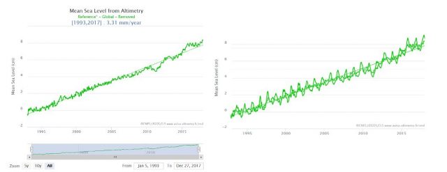 Bild 1 Satellitenpegel ohne / mit Saisonsignal. Quelle: AVISO+ Mean Sea Level product and image interactive selection, Quelle