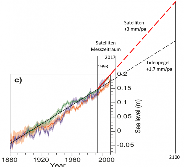 Komischer Weise verlaufen Tidenpegel und durch Satelliten gemessene nicht gleich. Die Satelliten zeigen den doppelten Anstiegswert. Die (überzeugende) Erklärung dieses Rätsels hat noch niemand gefunden (oder der Autor hat es übersehen).