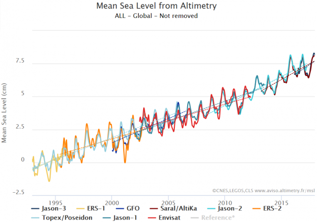 In contrast to all those observations, satellite altimetry claim there is a global mean rise in sea level of about