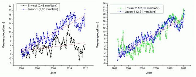 ... Der von Envisat gemessenen Anstieg des Meeresspiegels betrug im Zeitraum von Ende 2003 bis Ende 2011 lediglich 0,48 mm/Jahr, was 4,8 cm in 100 Jahren entsprechen würde. Die Messungen des Jason-1 Satelliten haben für den gleichen Zeitraum einen Anstieg von 2,05 mm pro Jahr gefunden. … Um diesem Umstand zu begegnen wurden bei der ESA bereits im letzten Jahr Methoden diskutiert, wie man die Envisat Daten rechnerisch an die Ergebnisse der Messungen der Jason Satelliten angleichen kann. Diese Anpassung wurde jetzt beim Umstellen auf die neueste Version der Envisat Daten (Version 2.1) offensichtlich vorgenommen. Aus dem bisherigen minimalen Anstieg von 0,48 mm/Jahr wurde dadurch quasi über Nacht ein Anstieg von 2,32 mm/Jahr. Wer nach einer Begründung für diese Maßnahme sucht, der wird auf der Aviso-Homepage unter “Processing and corrections” fündig. Dort heißt es: ’sign of instrumental correction (PTR) corrected via external CLS input (impact of +2 mm/year drift)‘ Man hat also einen Abgleich an externen Daten vorgenommen. Es findet sich allerdings kein Wort dazu, was für Daten das sind oder welcher Umstand diesen radikalen Eingriff notwendig gemacht hätte.“