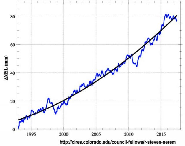 … Steve Nerem war auch Ko-Autor des schreiend alarmistischen Artikels in der Washington Post im Mai 2016 mit dem Titel „10 things you should know about sea level rise and how bad it could be”, in welchem gesagt wird dass „Wissenschaftler schätzen, dass wenn sich die Welt um 4 bis 5°C erwärmt, was für das Ende des Jahrhunderts projiziert wird, wenn wir keine Maßnahmen gegen den Klimawandel ergreifen, alles Eis wahrscheinlich schmelzen wird. Das würde einen Meeresspiegel-Anstieg um 70 Meter bewirken“.