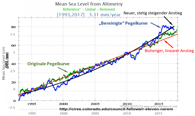 Vor drei Jahren gab es eine Studie, welche diesen Anstieg für zu hoch hielt und aufgrund von Messfehlern der Satelliten einen reduzierten Anstieg von 2,6 … 2,9 mm/Jahr ermittelte: