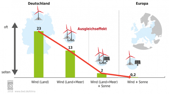 -wenn man das gesamte Europa flächendeckend mit Solar und Windkraft bedeckt, passiert es nur noch 0,2 mal, also einmal in ca. vier Jahren.