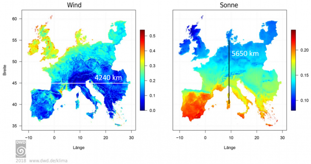Bild 4 Europa (vom Autor mit Entfernungsangaben ergänzt). Quelle: [2] DWD: Die linke Grafik zeigt den mittleren Kapazitätsfaktor der Windenergie für Europa (Mittelwert 1995 bis 2015, für Länder südlich von 60° nördlicher Breite). Die Berechnung basiert auf der Annahme einer typischen modernen Windkraftanlage. Gezeigt wird der langjährige Mittelwert für eine Nabenhöhe von 116 m. Deutlich werden die hohen Auslastungen in den nordwestlichen Küstenregionen Europas – vor allem im Vergleich zu den geringeren Werten in Südosteuropa. Die rechte Grafik zeigt den mittleren Kapazitätsfaktor für eine repräsentative Photovoltaikanlage als langjährigen Mittelwert für Europa. Deutlich erkennbar sind die höheren zu erwartenden Erträge im südlichen Europa.