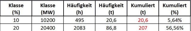 Nimmt man 10 % der Anschlussleistung als Maßstab, dann liegt die Stromerzeugung über insgesamt 20,6 Tage im Jahr darunter , nimmt man 20 % als Minimum an, passiert dies bereits über 207 Tage im Jahr, also das Zehnfache der Zeit.