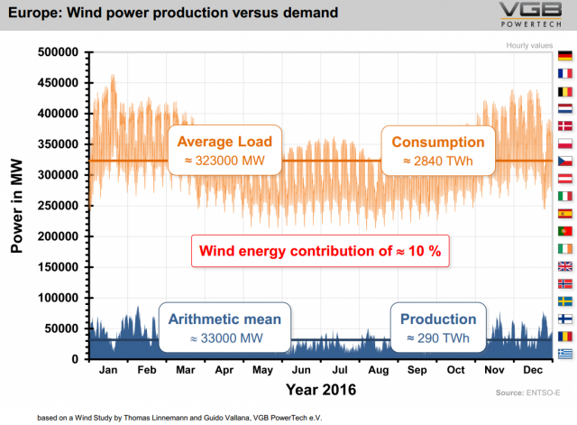 Das folgende Bild 12 zeigt den Unterschied der aktuell EU-weit installierten Windleistung zur verbrauchten. Wird dieser Ausbau verzehnfacht, wäre erst einmal der theoretische Nettobedarf gedeckt. Zur Deckung der enormen Leitungsverluste und Flautezeiten wird man wohl mit dem 20-fachen – zuzüglich des Leitungsausbaus, zuzüglich eines noch nicht im Ansatz gelösten Speicherausbaus rechnen müssen.