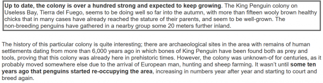 An den Küsten der Antarktis wird es immer wärmer … Für die Königspinguine seien die ganzen klimatischen Veränderungen und ihre Folgen kein Problem, weil sie schon an wärmeres Wasser gewöhnt seien und auf festem Land brüten. Ihr Bestand sei die letzten Jahre sogar gestiegen.