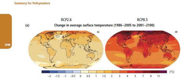 “The increase of global mean surface temperature by the end of the 21st century (2081–2100) relative to 1986–2005 is likely to be 0.3°C to 1.7°C under RCP2.6, 1.1°C to 2.6°C under RCP4.5, 1.4°C to 3.1°C under RCP6.0 and 2.6°C to 4.8°C under RCP8.59. The Arctic region will continue to warm more rapidly than the global mean (Figure SPM.6a, Figure SPM.7a). {2.2.1, Figure 2.1, Figure 2.2, Table 2.1}”