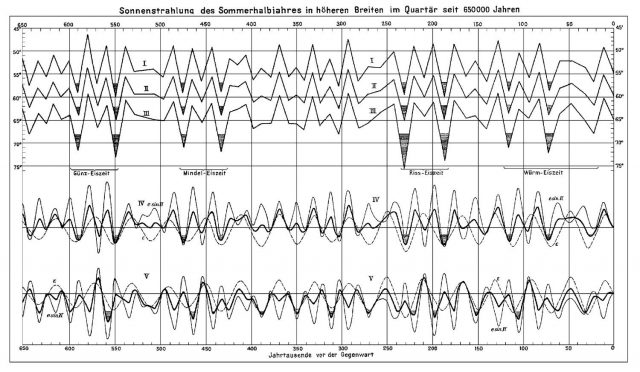 Und hier ist die entsprechende Abbildung aus dem Buch von Köppen und Wegener (Seiten 258/259), „Sonnenstrahlung des Sommerhalbjahres in höheren Breiten im Quartär seit 650 000 Jahren“: