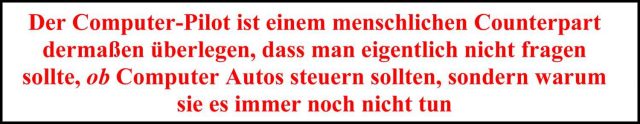 - „Der Computer-Pilot ist einem menschlichen Counterpart dermaßen überlegen, dass man eigentlich nicht fragen sollte, ob Computer Autos steuern sollten, sondern warum sie es immer noch nicht tun“, (Bild 3)