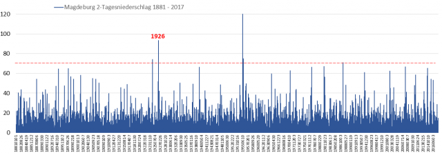 Bild 27 Zwei-Tagesniederschlag Magdeburg (DWD-Station 3126). Grafik vom Autor anhand der Daten erstellt