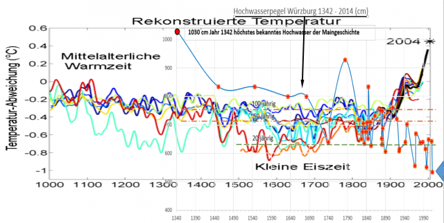 Dazu nochmals der Pegelverlauf bei Würzburg, der gut mit den Pegelbildern anderer Flüsse (Bild 28) übereinstimmt, diesmal in eine Temperaturrekonstruktion kopiert.