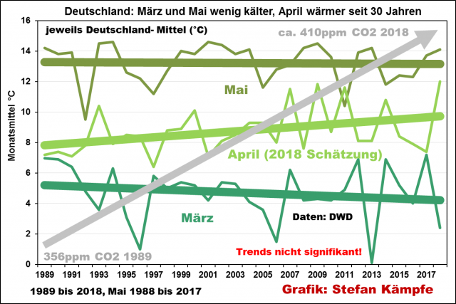 Abb. 1: Einheitliche Erwärmungstrends in den drei Frühlingsmonaten fehlen seit 1989 (Mai seit 1988) trotz massiv steigender CO2– Konzentration (Mauna Loa). Während März und Mai minimal abkühlten, wurde der April deutlich wärmer. Da keiner der Trends signifikant ist, gab es auch im Frühling insgesamt seit 30 Jahren keinen signifikanten Trend. Der sehr milde April 2018 wurde im Deutschland- Mittel auf 12°C geschätzt; wenige Zehntelgrad Abweichung ändern an der Aussage nichts; der endgültige Wert wird vom DWD erst zum Monatsende bekanntgegeben.