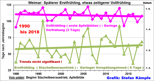 Abb. 2: In Weimar hat sich der Vorfrühling (Erste Laubblätter der Wildstachelbeere) leicht verspätet, der Vollfrühling (erste Apfelblüten) leicht verfrüht. Doch solche Schwankungen sind völlig normal und keine Anzeichen für einen besorgniserregenden Klimawandel.