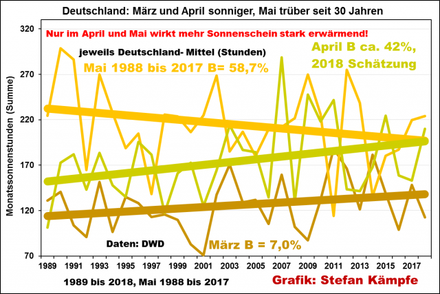 Abb. 3: Während März und April seit 1989 sonniger wurden, nahm die Sonnenscheindauer im Mai (1988 bis 2017) ab. Im April und vor allem im Mai beeinflusst die Sonnenscheindauer die Variabilität der Lufttemperaturen signifikant; sonnige Monate sind tendenziell wärmer. Die Märzensonne hat hingegen nur einen gering wärmenden Einfluss, was erklärt, warum der März seit 30 Jahren trotz leicht steigender Sonnenscheindauer etwas kälter wurde. Für April 2018 wurde die Sonnenscheindauer im DWD- Mittel auf 210 Stunden geschätzt.