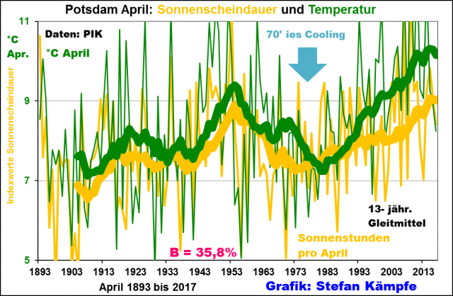 Auch langfristig zeigt sich ein wesentlicher Zusammenhang zwischen Apriltemperaturen und Sonnenscheindauer. Die Sonnenscheindauer liegt leider für das DWD- Mittel erst seit 1951 vor. Daher werden die seit 1893 vorliegenden Daten aus Potsdam in die Betrachtungen mit einbezogen: