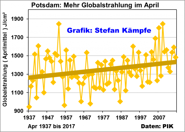 Noch ein wenig enger ist der Zusammenhang zwischen Apriltemperatur und Globalstrahlung, welche aber erst seit 1937 in Potsdam erfasst wird und seitdem tendenziell zunahm: