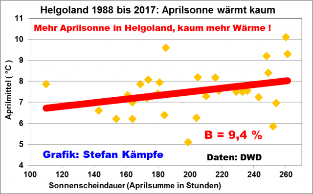 Abb. 7a und 7b: Während die Aprilsonne im Deutschland- Mittel (oben) die Lufttemperaturen wesentlich mitbestimmt, muss sie auf Helgoland erst das Meerwasser erwärmen; ihre Wirkung auf die Lufttemperaturen entspricht nur etwa der des März für Gesamtdeutschland. Folglich erwärmte sich dort der April von 1988 bis 2017 nur um 0,8K; im DWD- Mittel dagegen um gut 1,4K.