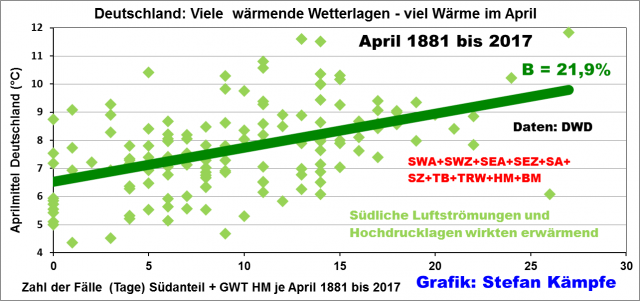 Abb. 9: Aprilmonate mit häufigen Hochdruckgebieten über Mitteleuropa und Großwetterlagen mit südlichem Strömungsanteil sind tendenziell wärmer.