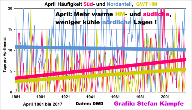 Auch langfristig erwärmte sich der April in Deutschland wegen geänderter Großwetterlagenhäufigkeiten; für den Zeitraum ab 1881 liegen aber nur die ungenaueren Ergebnisse der Großwetterlagen-Klassifikation nach HESS/BREZOWSKY vor. Besonders erwärmend wirken im April alle Großwetterlagen mit südlichem Strömungsanteil sowie der Großwettertyp Hochdruckgebiet über Mitteleuropa (HM). Die Häufigkeitsverhältnisse dieser insgesamt 10 Großwetterlagen erklären immerhin ein gutes Fünftel der Apriltemperaturvariabilität in Deutschland: