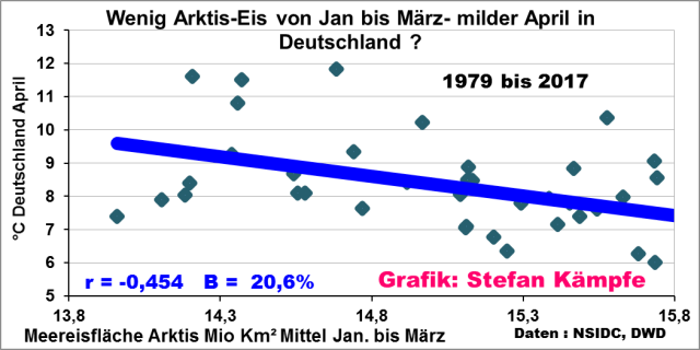 Abb. 11: Die Ausdehnung des arktischen Meereises der drei Vormonate Januar bis März, vom Satelliten seit 1979 in Millionen km² gemessen, beeinflusst die Apriltemperaturen in Deutschland. 2018 bestätigte sich dieser Zusammenhang, welcher aufgrund der hohen Streuung aber nur mäßig ausfällt und daher keine sicheren Prognosen der Apriltemperaturen erlaubt.