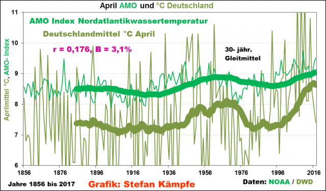 Der April ist außerdem der erste Monat im Jahresverlauf mit einem andeutungsweise vorhandenen, positiven Zusammenhang zwischen AMO und Deutschland- Temperaturen; allerdings ohne Signifikanz (diese besteht für die Monate von Juni bis November sowie für das Jahr insgesamt). Da die AMO jedoch auch die Häufigkeitsverhältnisse der Großwetterlagen und das Verhalten des Arktiseises beeinflusst, darf ihre Bedeutung nicht unterschätzt werden: