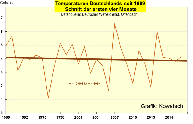 Ergebnis: Bereits seit 30 Jahren haben die ersten vier Monate des Jahres laut DWD-Daten eine leichte, allerdings nicht signifikante Tendenz zur Abkühlung. Doch diese Daten des DWD sind nicht wärmeinselbereinigt. Außerhalb der Städte, insbesondere in der freien Natur ist die Abkühlungstendenz bereits deutlich.