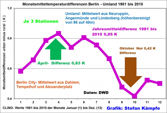 Grafik 5: In der CLINO- Normalperiode von 1981 bis 2010 gefundene UHI- Differenzen in Kelvin, gebildet aus den Mitteln dreier urbaner Stationen in Berlin und dreier ländlicher Stationen in Brandenburg. Hohen, verstädterungsbedingten Differenzen von über 0,8 K im April stehen geringere im Spätsommer/Frühherbst gegenüber. Die jahreszeitlich bedingten UHI- Effekte sind in Berlin eng mit geänderten Sonnenscheinverhältnissen und Großwetterlagenhäufigkeiten verknüpft.