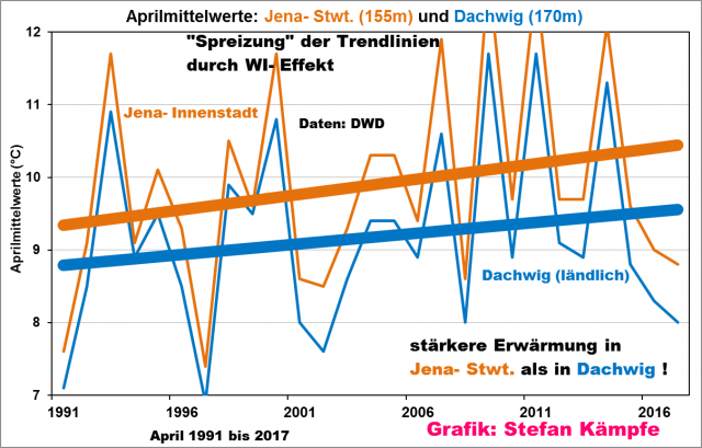 Grafik 6: Stärkere April- Erwärmung an der Innenstadt-Station Jena-Sternwarte im Vergleich zum ländlichen, etwa 50 Km entfernten Dachwig. Beide Stationen haben fast die gleiche Höhenlage; die 2018er Werte lagen noch nicht vor. Dachwig-Werte leider erst seit 1991 verfügbar.