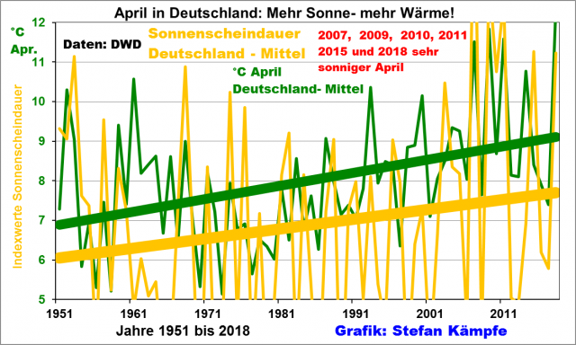 Na ja – sehen wir es doch viel einfacher: Der April 2018 war ein ausgesprochen sonniger Monat ohne viel Wolkenbedeckung und bei immer sauberer Luft. Und die Sonne hat im April schon viel kraft…