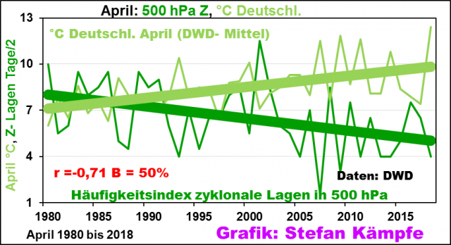 Grafik 7b: Seit 1980 liegen die Daten der Objektiven Wetterlagenklassifikation des DWD vor. Besonders stark kühlend wirken die in der Höhe zyklonalen Wetterlagen, welche seit 1980 deutlich seltener auftraten. Damit lassen sich 50% der Variabilität der Apriltemperaturen erklären.