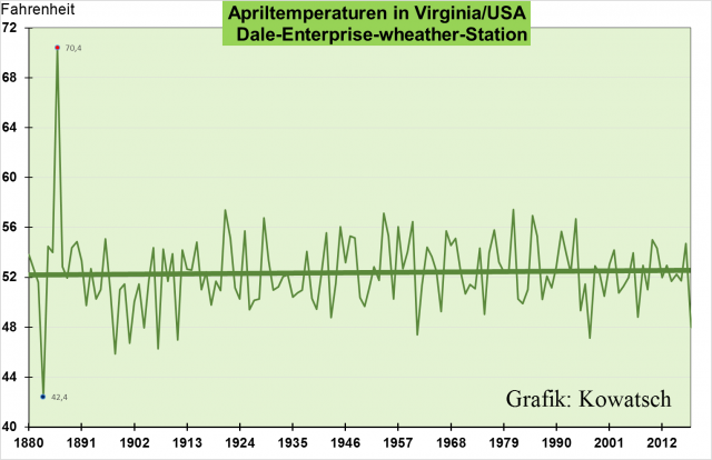 Grafik 9: An der Ostküste der USA in Virginia verläuft der Monat April in der ländlichen Gegend in geordneten Bahnen. Es handelt sich um die älteste Klimastation Virginias. Außer den 2 Ausreißern vor über 100 Jahren haben sich die Temperaturen stabilisiert. Wo ist die Klimaerwärmung des Monates April auf dem Lande in Amerika? Der Verlauf von Washington-City sieht freilich anders aus.