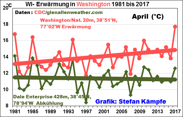 Grafik 10: Ähnlich wie in Deutschland erwärmte sich das WI-belastete Washington; das ländliche Dale Enterprise kühlte minimal ab. Der kalte April 2018 fehlt noch in der Grafik.