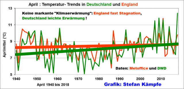 Abschließend noch ein Blick nach Zentralengland, wo der April gleichfalls um 1975 tendenziell kühler war. Dort fiel der 2018-er April zwar auch zu mild aus, doch weit entfernt von neuen Rekorden. Seit 1940 erwärmte sich dort der April im Gegensatz zu Deutschland kaum: