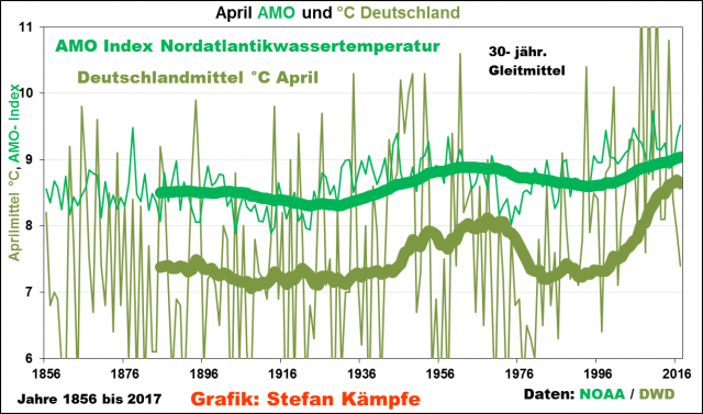 Grafik 12: Das Diagramm des Klimaforschers Stefan Kämpfe zeigt: Mit dem Ende der aktuellen AMO-Warmphase, dessen genauer Eintritt freilich nicht exakt vorhergesagt werden kann, könnte auch für den Monat April ein Temperaturrückgang einsetzen, und der deutet sich (möglicherweise) schon an. Auch wegen des Wärmeinseleffektes sind die Apriltemperaturen der letzten 20 Jahre noch auf einem hohen Niveau. Die AMO-Werte für April 2018 liegen noch nicht vor.
