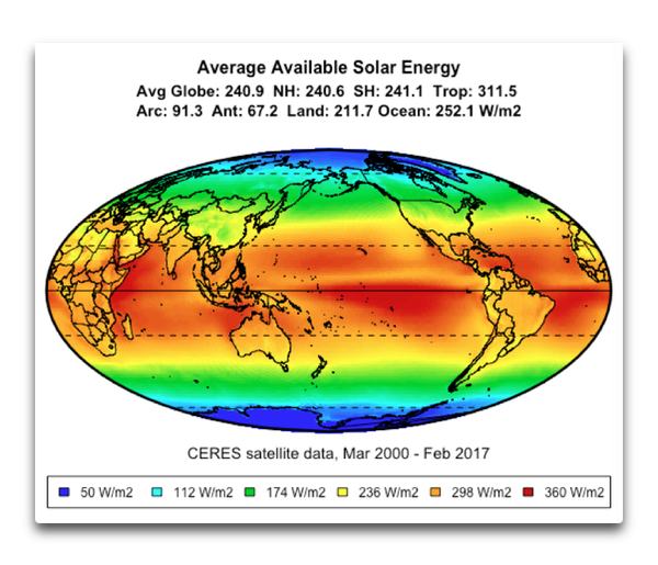 Abbildung 2: Karte der globalen Verteilung der verfügbaren Solarenergie. Hierbei handelt es sich um verbleibende Solarenergie nach Abzug der Albedo-Reflektion des einfallenden Sonnenlichtes zurück ins Weltall.