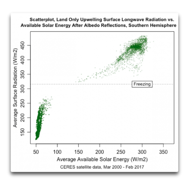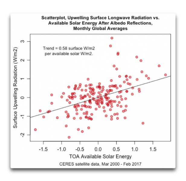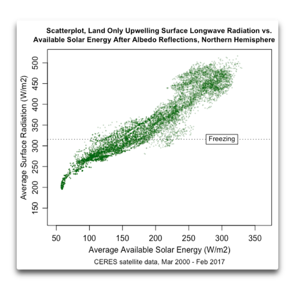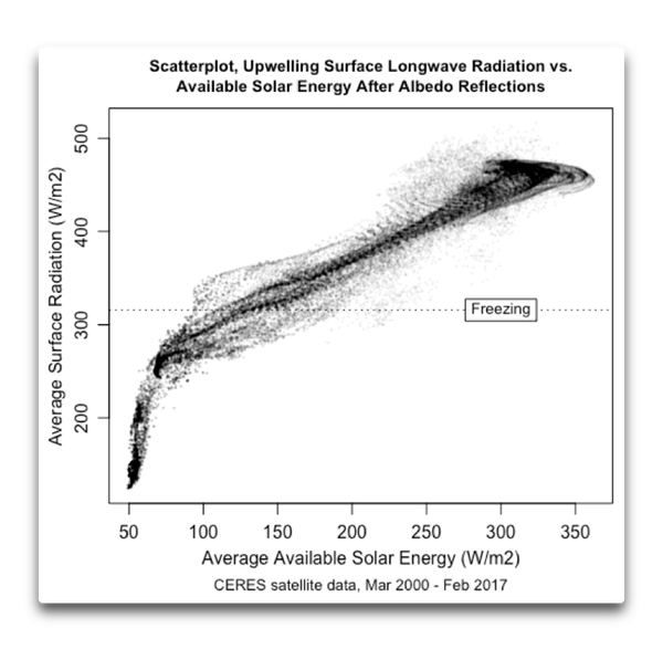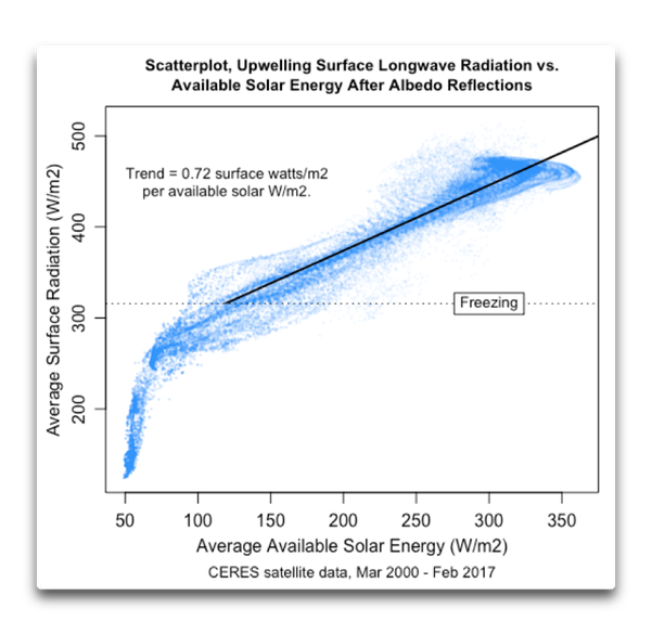 Wie können wir diesen offensichtlichen Widerspruch erklären? Für mich ist es ein Beweis für etwas, das ich schon viele Jahre lang gesagt habe, nämlich: Die Sensitivität der Temperatur an der Erdoberfläche auf die Menge der einfallenden Strahlung ist keine Konstante, wie es von Mainstream-Klimawissenschaftlern vertreten wird. Stattdessen ist es eine Funktion der Temperatur. Bei Temperaturen über dem Gefrierpunkt nimmt die ausgehende Strahlung um etwa drei Viertel eines W/m² zu für jedes zusätzlich einfallende W/m² der Sonnenstrahlung.