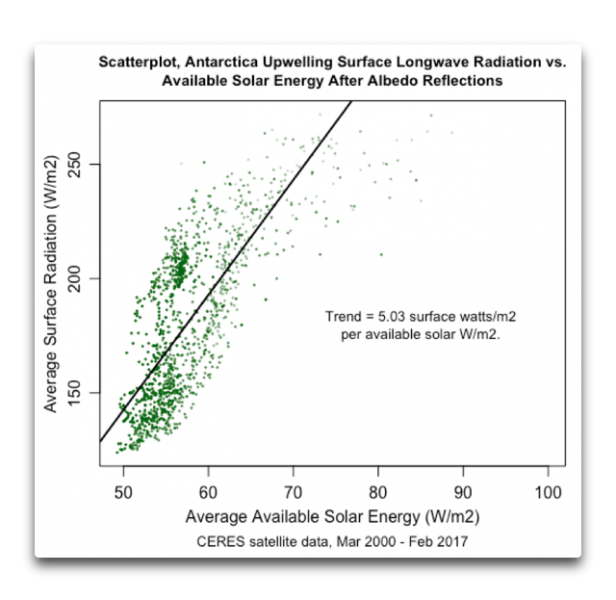 ● Unterhalb des Gefrierpunktes nimmt diese Reaktion mit abnehmender Temperatur zu, bis die Reaktion bei den typischen Antarktis-Temperaturen zwischen -20°C und -60°C etwa 5 W/m² für jede Zunahme der Solarenergie um 1 W/m² beträgt.
