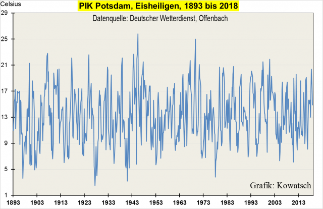 Erg: Obwohl Potsdam seit 1893 stark in die Fläche gewachsen ist und der Wärmeinseleffekt sich damit vergrößert hat, und vor allem auch der CO2-Ausstoß der brandenburgischen Landeshauptstadt stark angestiegen ist, konnte Kohlendioxid keine Erwärmung bewirken. Die Eisheiligen sind somit CO2-resistent. Die fünf Tage in der Maimitte 2018 reihen sich in einen ausgeglichenen Verlauf ein.
