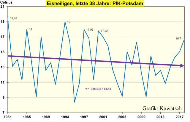 PIK-Potsdam: Beginnen wir mit der Station des Potsdamer Institutes für Klimafolgenforschung, dem Zentrum des deutschen Erwärmungsorakels. Der Schnitt der fünf Tage betrug dort 2018: recht angenehme 16,7°C