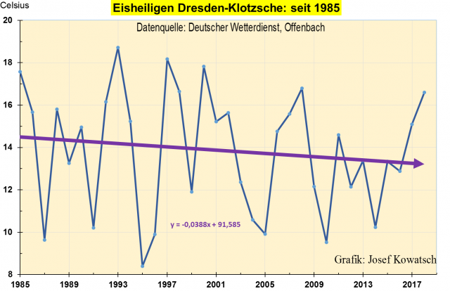 Grafik 3: DWD-Station Dresden Klotzsche: Trotz der milden Eisheiligen 2018 ist die Trendlinie der letzten 34 Betrachtungsjahre eindeutig fallend.