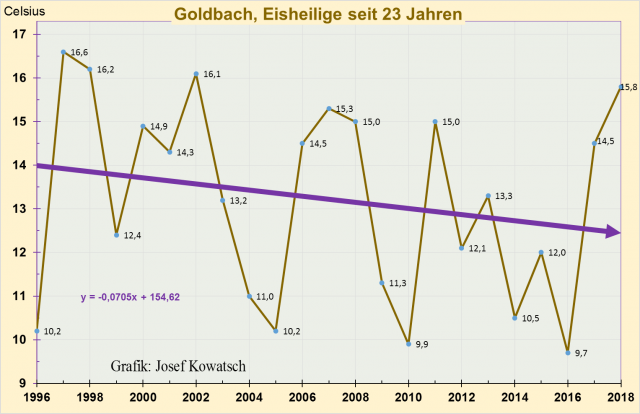 Goldbach: Und schließlich Goldbach bei Bischofswerda, ein kleiner ländlicher Vorort. Die Wetterstation gibt es erst seit 1996, und dort auf dem Lande werden die Eisheiligen deutlich kälter. Bei Medienfalschmeldungen der letzten Jahre mit der Zeitangabe „in jüngster Zeit“ oder „in der „Gegenwart“ würden die Eisheiligen wärmer, könnte man vielleicht die letzten 20 Jahre meinen. Aber auch für „in jüngster Zeit“ ist das Ergebnis eindeutig, die Eisheiligen werden kälter. Je kürzer der Betrachtungszeitraum, desto fallender die Trendlinien. Fallende Temperaturtrendlinien sind das genaue Gegenteil von Erwärmung. Der Eisheiligenschnitt 2018 war 15,8°C in Goldbach, wie erwartet kälter als in den beiden Städten.