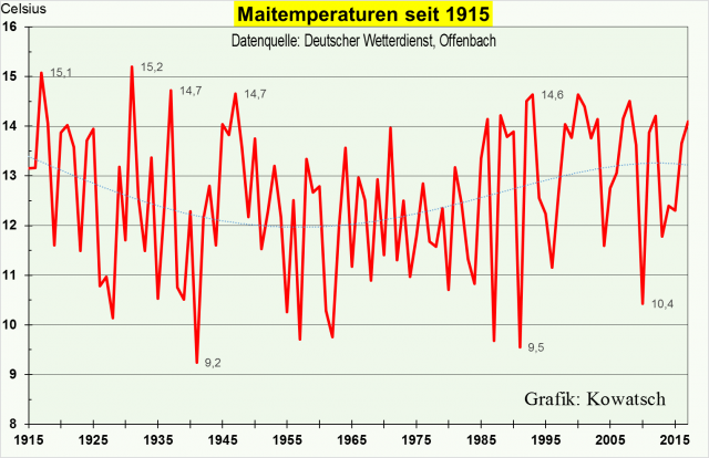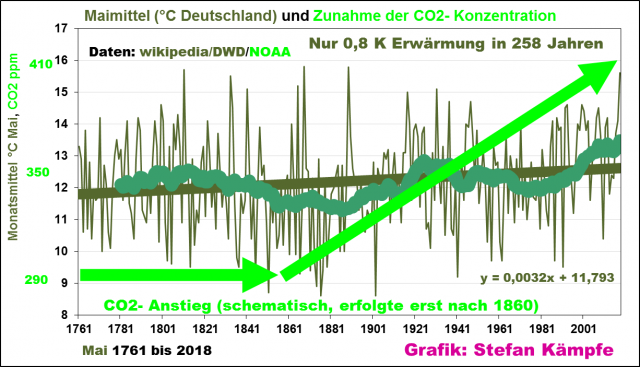 Abb. 3: Die Maitemperaturen Deutschlands zeigen seit 1915 überhaupt keine Erwärmung mehr. In der Mitte des letzten Jahrhunderts waren die Maimonate kälter, momentan sind wir wieder auf einem höheren Niveau. Mit CO2 hat der Verlauf nichts zu tun, denn dieses lebensnotwendige Gas hat im ganzen Zeitraum kontinuierlich zugenommen.