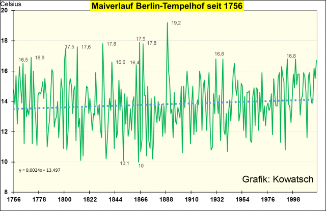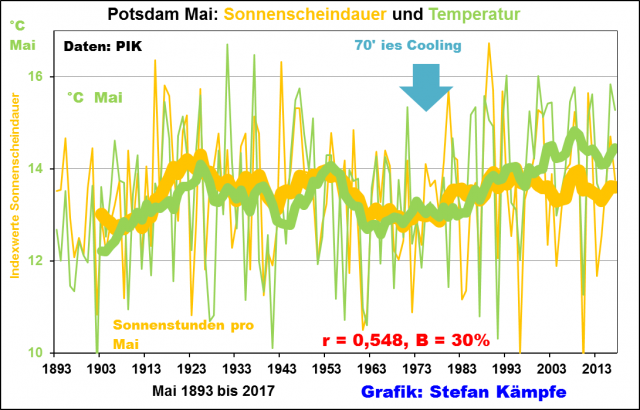 Abb. 2: Zwei Dinge fallen auf: Der Mai wurde kaum wärmer, der unbedeutende Anstieg dürfte eine reine Wärmeinselerwärmung aufgrund der Standortverlegung und wärmenden Veränderung sein. Und: Die wirklich warmen Maimonate liegen lange zurück. Der Mai 2018 in der Großstadt Berlin ordnet sich lediglich deutlich über dem Durchschnitt und deutlich wärmer als 2017 ein. Der Grund dafür dürfte in der Zahl der Sonnenstunden liegen, die 2018 in Berlin deutlich über dem Soll lagen.