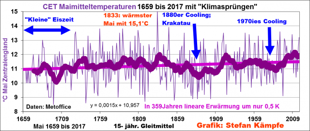 Die folgende Messreihe ist deshalb so bemerkenswert, weil sie auf dem Höhepunkt der „Kleinen Eiszeit“, einer markanten, vermutlich hauptsächlich solar bedingten („Maunder- Minimum“) Abkühlungsphase beginnt. Seitdem sollte sich dort der Mai doch deutlich erwärmt haben. Aber diese „Erwärmung“ fiel mit 0,5 Kelvin (entspricht einem halben Grad Celsius) noch bescheidener als in Deutschland aus: