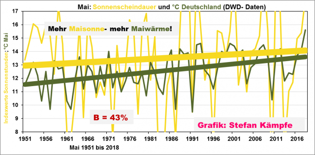 Zusammenfassung: Der warme Mai 2018 lässt sich ganz ohne CO2– bedingte Erwärmung auf eine zu hohe Sonnenscheindauer sowie gehäuft auftretende südliche Großwetterlagen und Hochdruckgebiete über Mittel- und Nordeuropa zurückführen; auch während der vergangenen Jahrzehnte sowie seit Aufzeichnungsbeginn erwärmte sich der Mai in Deutschland wegen zunehmender Besonnung, geänderter Großwetterlagenhäufigkeit und diverser Wärmeinseleffekte nur unwesentlich.