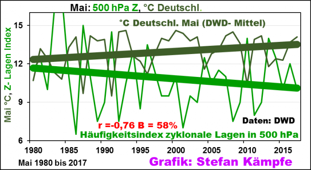 Abb. 7: Im Mai wirken in der Höhe zyklonale Großwetterlagen stark kühlend; ihre Häufigkeit nahm aber seit 1980 merklich ab. Näheres zu Objektiven Wetterlagenklassifikation des DWD hier.