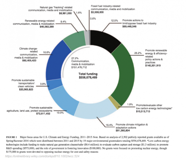 Autor der Studie war Matthew Nisbet, Professor für Kommunikations-Studien und Gastprofessor für Public Policy and Urban Affairs an der Northeastern University. Er analysierte 556,7 Millionen Dollar, welche „hinter den Kulissen“ an 19 große Umweltstiftungen geflossen waren im Zeitraum 2011 bis 2015, und zwar unmittelbar nach dem Scheitern einer cap-and-trade-Gesetzgebung im Jahre 2010.