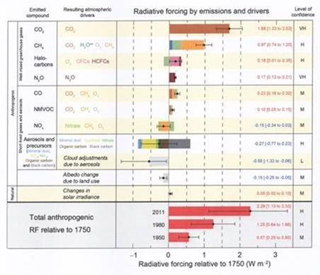Abbildung 2 zeigt die Tabelle der ,Antriebe‘ [forcings] aus dem AR 5. Dies sind die Variablen, welche sie hinsichtlich menschlicher Gründe des Klimawandels für bedeutend halten. Rechts findet sich eine Spalte „Vertrauensniveau“ [Level of Confidence] Wer bestimmt das, und wie wird es gemessen? Es ist standardmäßig eine subjektive Maßzahl, aber das IPCC bevorzugt sie. Nur eine Variable ist markiert als ,Sehr Hoch‘, und zwar das CO2, eine eigennützige Abschätzung, die sich leicht widerlegen lässt. Nur drei der 11 Variablen sind als ,Hoch‘ gelistet. Man betrachte davon lediglich eine, nämlich Aerosole. Kann mir jemand die Daten beschaffen der Anzahl und der Natur der Aerosole in der Atmosphäre ebenso wie deren Volumen und deren zeitlicher Änderung über jedweden Zeitraum?